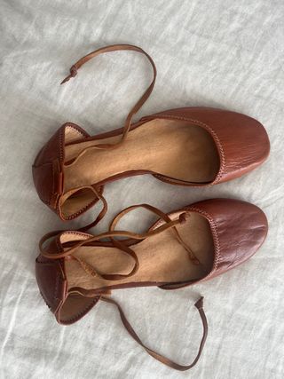 Preciosas bailarinas de piel marrón, perfectas para un look casual y elegante. Son dos pares de bailarinas con cordones. - Diseño sencillo y atemporal. - Piel suave y de apariencia resistente. - Cordones para ajustar al pie. Precio original: 45€ No tienen uso, me quedan pequeñas.