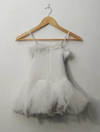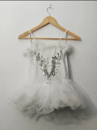 Traje de bailarina talla 130 - Diseño con lentejuelas plateadas. - Adornado con plumas blancas. - Falda de tul. - Tirantes finos.