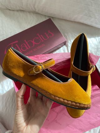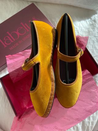 Zapatos Flabelus de terciopelo en color amarillo mostaza. Cierre de hebilla. - Material exterior: Terciopelo. - Detalle de pespunte en la suela. - Forro interior.