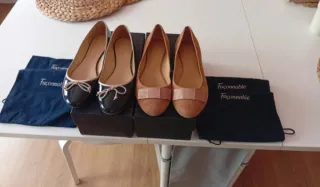 Elegantes bailarinas de la marca Faconnable. - Un par en color negro brillante con detalle de lazo. - Un par en ante color marrón con detalle de lazo. - Incluye dos bolsas de tela para guardarlas. Bailarinas Faconnable el precio de cada par es 195 Se deja en 59 cada par