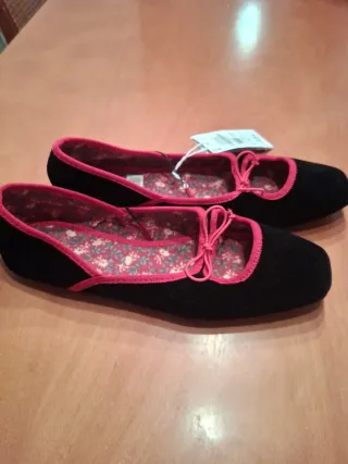 Elegantes bailarinas de terciopelo con detalles en rojo. - Material exterior: terciopelo. - Forro interior estampado. - Cierre con lazada. - Ribete decorativo.