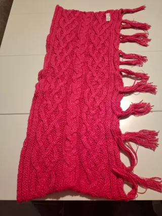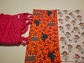 Conjunto de tres buff con divertidos diseños infantiles. - Un pañuelo de punto grueso en color fucsia con flecos. - Un pañuelo con estampado de brujas y ratones. - Un pañuelo con estampado de bailarinas.