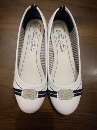 Elegantes bailarinas de la marca Tom Tailor. - Diseño en color blanco con detalles en azul marino. - Adorno metálico en la parte delantera. - Interior forrado a rayas.