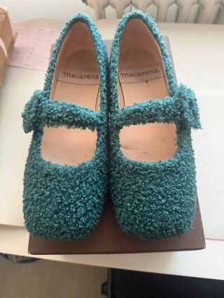 Manoletinas de la marca Macarena en color verde azulado. Han sido usadas solo dos veces, estan impecables, recien compradas - Diseño con tira - Acabado texturizado.