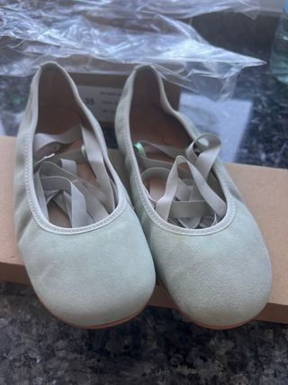 Manoletinas tipo bailarina en color verde salvia. Cierre con cintas. - Modelo: Bailarina Cintas Ante - Referencia: 3015.Verde-Salvia. Solo se han usado una vez y muy poco rato.