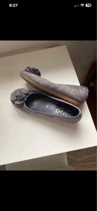 Manoletinas de ante en color gris, talla 36. Un calzado cómodo y elegante. - Detalle de flor en la pala. - Fabricadas en España.