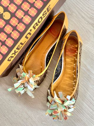 Bailarinas caladas con detalle de flor en la parte delantera. Color marrón y ribetes en naranja. Talla 38 (muy grande, corresponde a un 39). En perfecto estado, uno de los tacones algo gastado (hay foto). Costaron 75€. NO NEGOCIABLE.