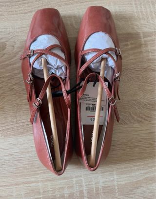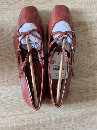Elegantes bailarinas de Zara con un diseño moderno. - Color marrón rojizo brillante. - Cierre con tiras cruzadas y hebillas. - Punta cuadrada.