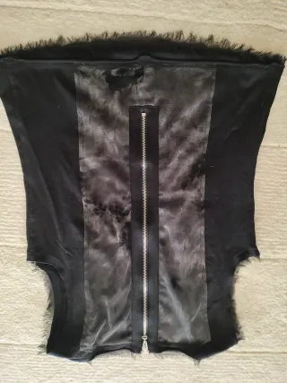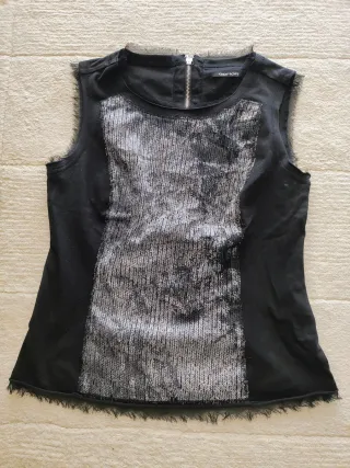 Camiseta sin mangas con un diseño frontal de lentejuelas plateadas y negras. - Cierre de cremallera en la espalda. - Acabado deshilachado en mangas y bajo. - Detalle de tul en el cuello.