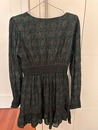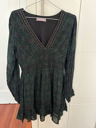 Vestido corto con estampado paisley y detalles de pedrería. - Escote en V. - Manga larga. - Bajo con volantes.