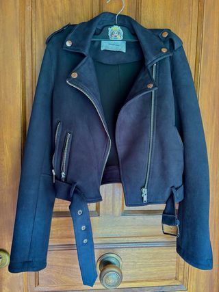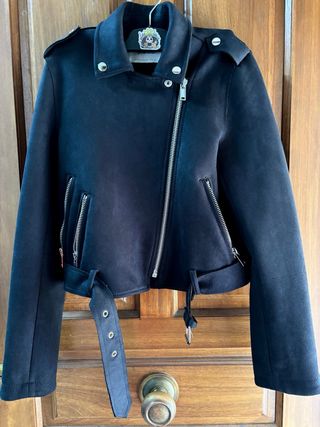 Cazadora de estilo motero - Diseño con cremallera asimétrica. - Bolsillos frontales con cremallera. - Cinturón ajustable en la cintura. - Detalle de solapas en los hombros.
