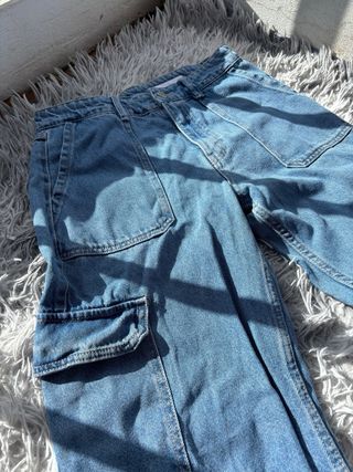 Pantalones vaqueros estilo cargo en azul tiene múltiples bolsillos