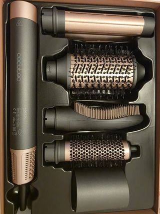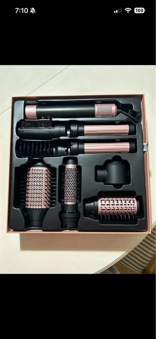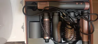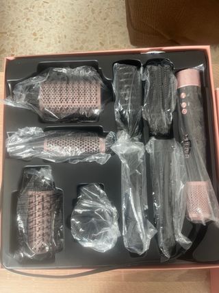 Comprado en Abril de 2024 en El Corte Inglés, usado muy poco. Conjunto de secador y moldeador de cabello con múltiples accesorios. - Incluye el secador principal. - Varios cabezales intercambiables para diferentes estilos. (6 diferentes) - Diseño en negro y dorado. -Estuche incluido. RECOGER EN PARLA