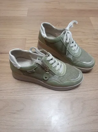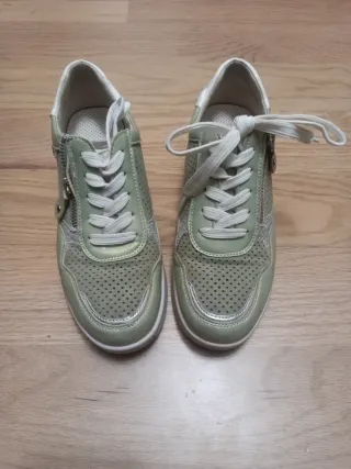 Zapatos de vestir estilo bamba de color verde con efecto brillante. Son de cordones pero también tienen cremallera para que una vez ajustados puedas quitarlos y ponerlos sin deshacer los cordones. Muy cómodos. Los compré el año pasado para ir a la oficina pero ahora teletrabajo, así que prácticamente no los he usado.
