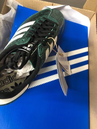 Zapatillas Adidas originales con un diseño llamativo. - Exterior con estampado de piel de serpiente. - Detalle de las tres franjas blancas. - Suela de goma negra.