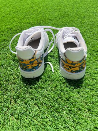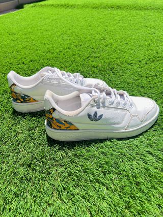Zapatillas deportivas Adidas con un diseño llamativo. Zapatillas deportivas bambas Adidas Adidas PWJ 001004 Handball Spezial talla 38, blancas con detalle en amarillo y azul, con poco uso. - Parte superior blanca. - Detalle multicolor en el talón y lateral. - Logo de Adidas en el lateral.