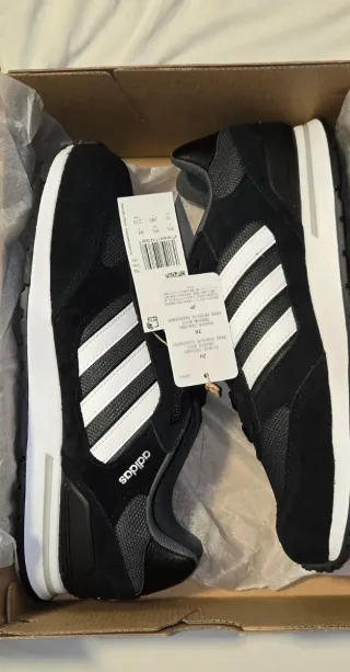 Zapatillas deportivas Adidas Run 80s en tonos negros y grises. Un diseño clásico y versátil. Talla 44. Nuevas a estrenar en su caja. - Parte superior de ante y malla. - Detalle de las tres rayas icónicas de Adidas. - Suela de goma para mayor tracción.