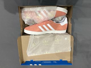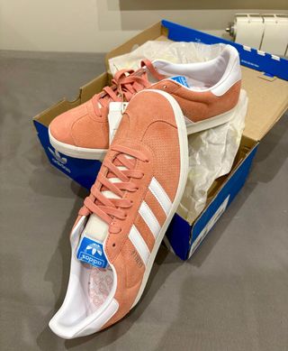 Zapatillas Adidas Gazelle en color rosa y blanco. - Modelo Gazelle. - Talla 45.5 (11 US). - Diseño clásico con las tres franjas.