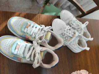 Pack de dos pares de zapatillas deportivas. ✔️Un par de zapatillas blancas con detalles de encaje floral💮. Más para primavera o día de poco frío. Están Nuevas ✔️ Otro par de zapatillas multicolor con colores pastel muy parecidas a un modelo de Adidas 💯 Recomiendo para días de frío 🌬️☔ Están poco puestas y muy bien conservadas. ✔️Ambos pares talla 35 ✔️En buen estado ambas ✔️ Muy poco puestas. La suela no presenta desgaste en ninguna👍🏻 ‼️Envío rápido con inpost‼️