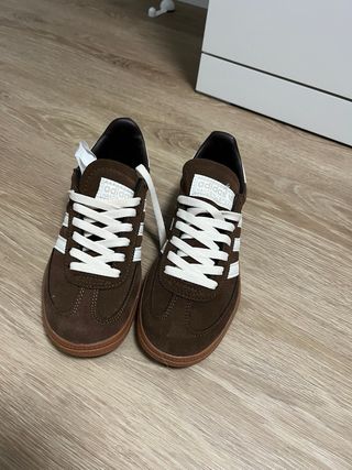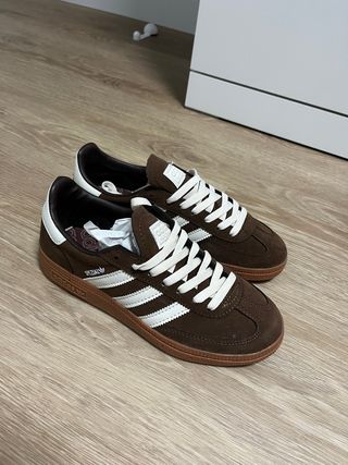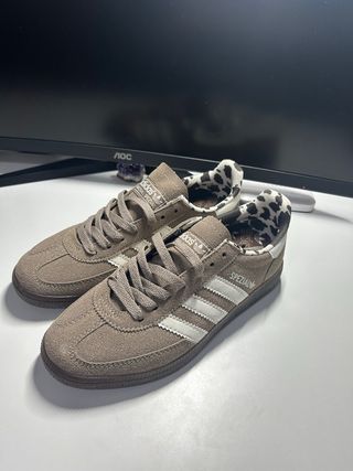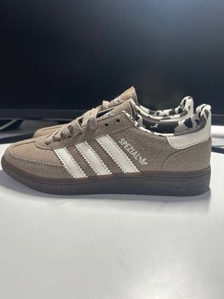 Zapatillas Adidas Handball Spezial en color marrón. Presentan un diseño único con detalles de estampado de vaca en el interior. - Exterior de ante. - Detalle de las tres rayas blancas. - Forro interior con estampado de vaca. Son bambas sin estrenar que le regalaron a mi hermana y nunca a usado. Precio poco negociable