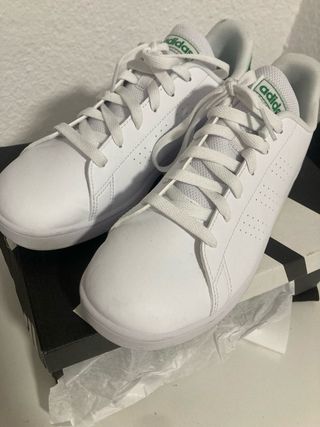 Zapatillas Adidas Advantage en color blanco con detalles verdes. - Diseño clásico y versátil. - Cierre con cordones. - Detalle de las tres rayas perforadas.