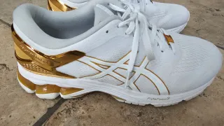 La mejor zapatilla para pronadores con pisada pronadora y control de estabilidad. Las vendo porque son 2 números más grandes de mi talla. Zapatillas deportivas Asics Gel Kayano 26 Platinum en color blanco con detalles dorados. - Diseño moderno y llamativo. - Combinación de blanco y dorado. - Modelo Platinum. Correr deporte running atletismo pisada pronador pronadora bambas