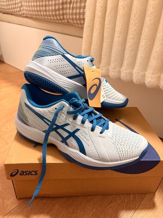 Bambas padel Asics para mujer. - Diseño moderno en azul claro con detalles en azul. - Suela de goma para mayor agarre. - Cierre con cordones. - Etiqueta de la marca incluida. - Precio NO negociable porque están sin estrenar.