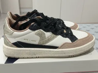 Zapatillas Victoria con un diseño moderno y llamativo. - Combinación de blanco, dorado y detalles en negro. - Acabado brillante en algunas zonas. - Logo de la marca visible.