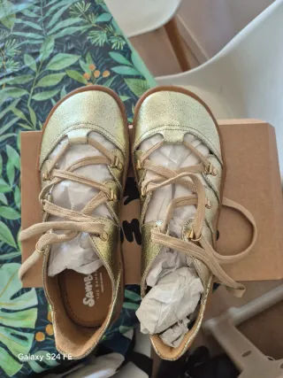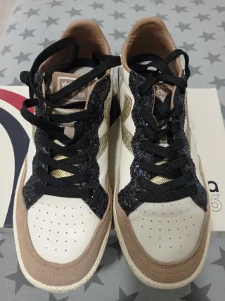 Zapatillas deportivas de la marca Gio con un diseño moderno y llamativo. - Combinación de colores dorado y gris. - Acabado brillante y detalles en ante. - Cordones a tono. Nuevas a estrenar