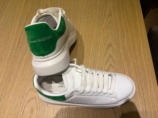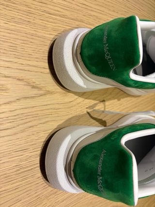 Zapatillas deportivas Alexander McQueen en color blanco con detalles en verde. - Diseño icónico de la marca. - Combinación de piel y ante. Bambas compradas y usadas una solo vez porque es un 45 pequeño
