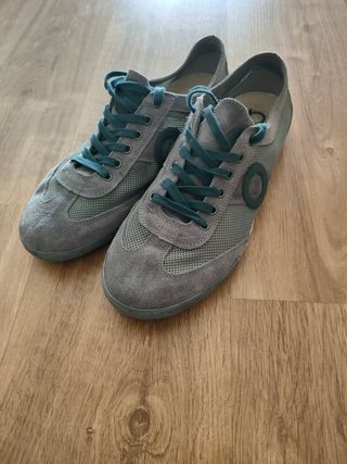 Zapatillas deportivas de la marca OC para hombre. Tiene desgaste de roze en los costados de cada bamba. La duela poco gastada. Número europeo 48 - Color gris y verde. - Cierre con cordones. - Diseño moderno y funcional.
