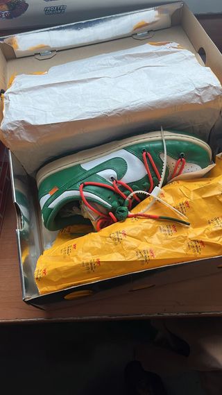 Zapatillas de la marca Off-White en colores verde y blanco. - Diseño distintivo con cordones naranjas. - Incluye etiquetas de autenticidad.