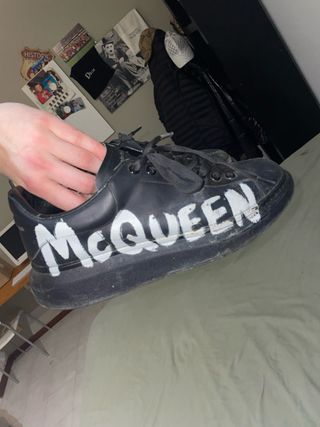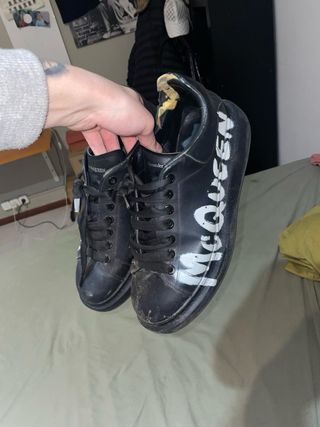 Zapatillas Alexander McQueen de color negro con el nombre de la marca pintado en blanco. - Diseño llamativo. - Cordones negros. como se puede ver hay un zapato que esta un poco dañado por detras pero se puede arreglar , la vendo porque me va pequeña Antes de enviar las limpio