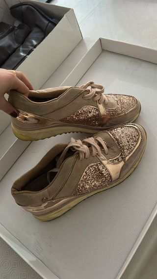 Zapatillas de estilo casual con un toque brillante. - Adorno con purpurina dorada. - Cierre con cordones. Bambas beig con adorno dorado.Talla 41 de la marca XTI.