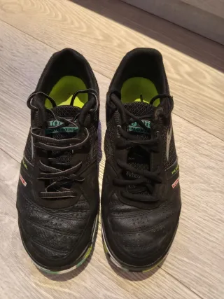 Zapatillas de fútbol sala Joma Toledo para niño, en buen estado. - Ideales para jugar en pistas cubiertas. - Suela de goma resistente. - Diseño deportivo y cómodo. - Talla: 32