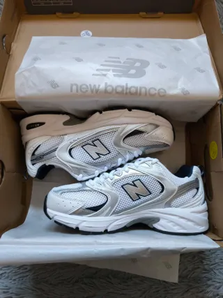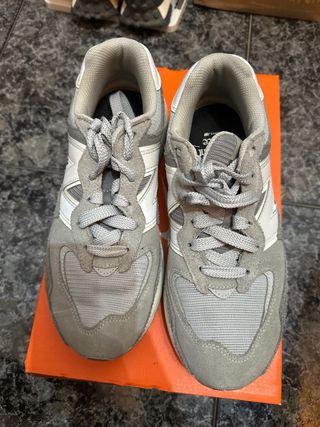 Zapatillas New Balance modelo 530 en color gris y blanco. Un clásico para el día a día. - Diseño deportivo. - Suela de goma. - Cordones blancos. Se han usadonuna semana pero se mejoraron y se secaron con un secador y las tres manchas negras es que se quemaron pero estan nuevas
