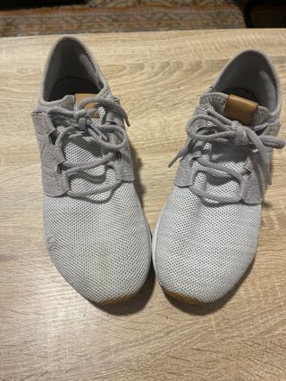 Zapatillas deportivas New Balance en talla 37. Combinan tonos grises y dorados. Solo han sido usadas una vez, me quedaban un poco justas y no las volví a usar.