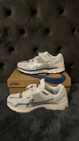 Zapatillas deportivas Nike P6000 con un diseño moderno y cómodo. - Combinación de colores plata y blanco. - Estilo deportivo y versátil.