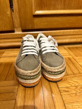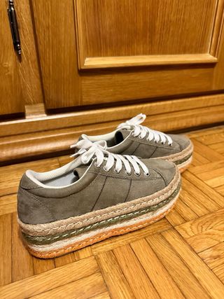 Zapatillas verde caqui de ante con plataforma de esparto. Sin estrenar.