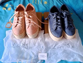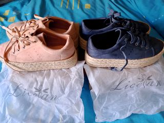 Pon tú el precio,zapatos bambas con plataforma de esparto, una azul otra rosa, talla 38, usadas muy poco.me costaron como se ve en la etiqueta 29,95€ cada una.