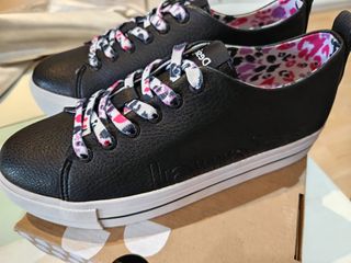 Zapatillas deportivas con plataforma, ideales para un look urbano. Son negras con detalles multicolor. - Diseño moderno y cómodo. - Suela gruesa y resistente. - Perfecto estado.