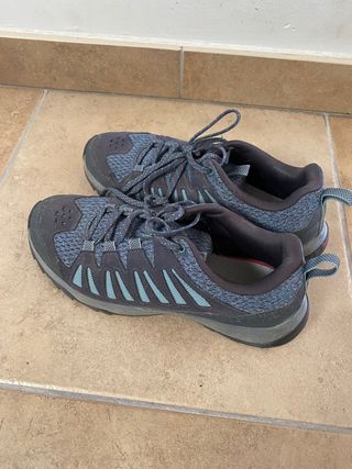 Zapatillas de senderismo Salomon con suela Contagrip. - Diseño deportivo en tonos azules y grises. - Cierre con cordones. - Tirador trasero para facilitar el calce. Idealnpara un 38 de pie. Supercómodas y suela con gran agarre. No pesqn, son ligeras y mullidas. Muy poco uso