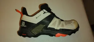 Zapatillas de montaña Salomon X Ultra 4 en color blanco y negro con detalles en naranja. - LAS VENDO POR ERROR DE TALLA , LAS HE UTILIZADO POCO, NADA DE SENDERISMO . - GOROTEX - SUELA CONTAGRIP. No tengo la caja , senderismo , montaña, treking, correr y caminar .