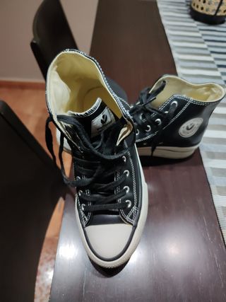 Zapatillas deportivas de plataforma, ideales para un look casual. Son negras y están en muy buen estado. Como se puede ver por el dibujo de la suela y el dibujo del interior, han tenido muy poco uso. - Tienen cordones blancos. - La plataforma es gruesa. - Tipo victoria.