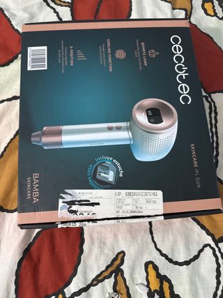 Depiladora IPL Cecotec Bambá Skincare en color dorado y plateado. Incluye estuche. - 5 posiciones de potencia. - Función de enfriamiento. - Lámpara de cuarzo con 300.000 pulsos.