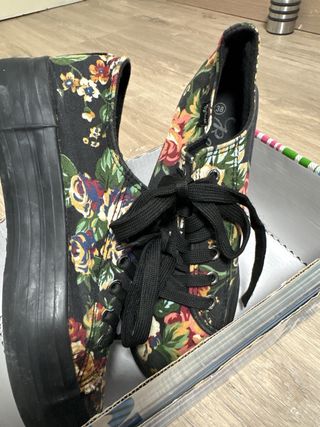 Zapatillas negras con un llamativo estampado floral y suela gruesa. - Diseño de plataforma. - Cierre con cordones. - Estampado floral multicolor.