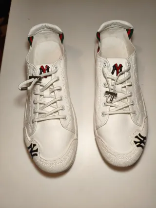 Bambas para hombre en color blanco de polipiel. Diseño moderno y cómodo. Muy suave - Detalle de logo M en la lengüeta. - Logo NY en la puntera. - Cordones blancos. - Tira decorativa en el talón con rayas verdes y rojas.