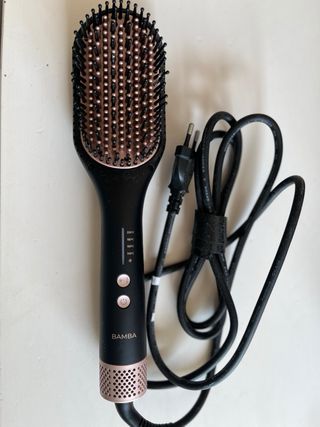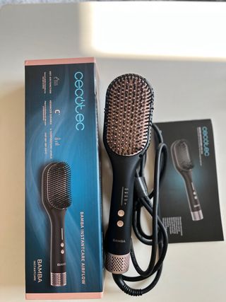Cepillo alisador Cecotec Bamba Instantcare en color negro y dorado. Cuenta con función de aire caliente y placas de cerámica avanzada. - Función de aire caliente. - Niveles de temperatura: 140-160-180-200°C.