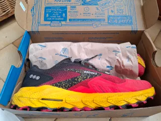 Zapatillas de trail running Brooks en talla 39. Diseñadas para terrenos de montaña. - Combinación de colores rojo y amarillo vibrante. - Detalle de logo Brooks en el lateral. - Suela con buen agarre para senderos.