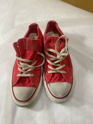 Zapatillas Converse rojas de lona. Son usadas, pero están en buen estado. - Modelo clásico de Converse Chuck Taylor All Star. - Talla de mujer. - Cordones de color beige.